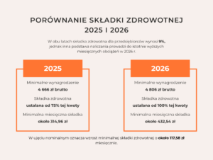 W obu latach składka zdrowotna dla przedsiębiorców wynosi 9%, jednak inna podstawa naliczania prowadzi do istotnie wyższych miesięcznych obciążeń w 2026 r.